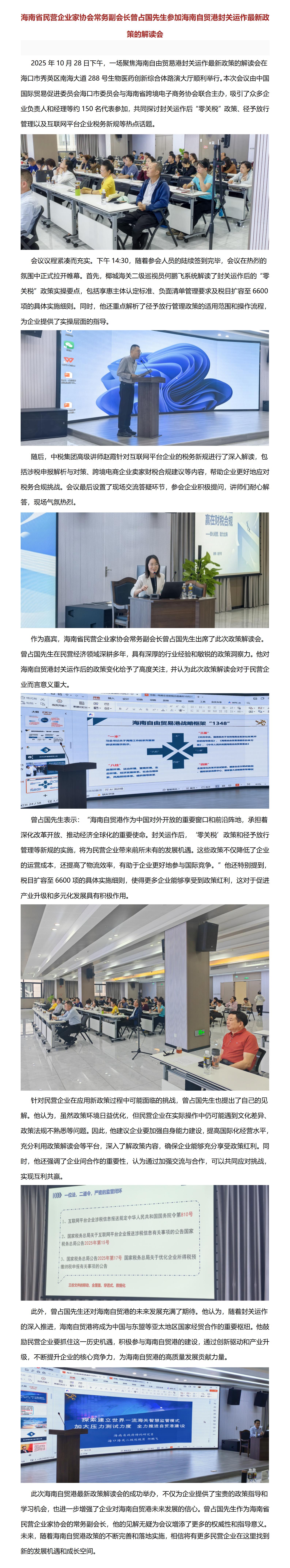 海南省民营企业家协会常务副会长曾占国先生参加海南自贸港封关运作最新政策的解读会
